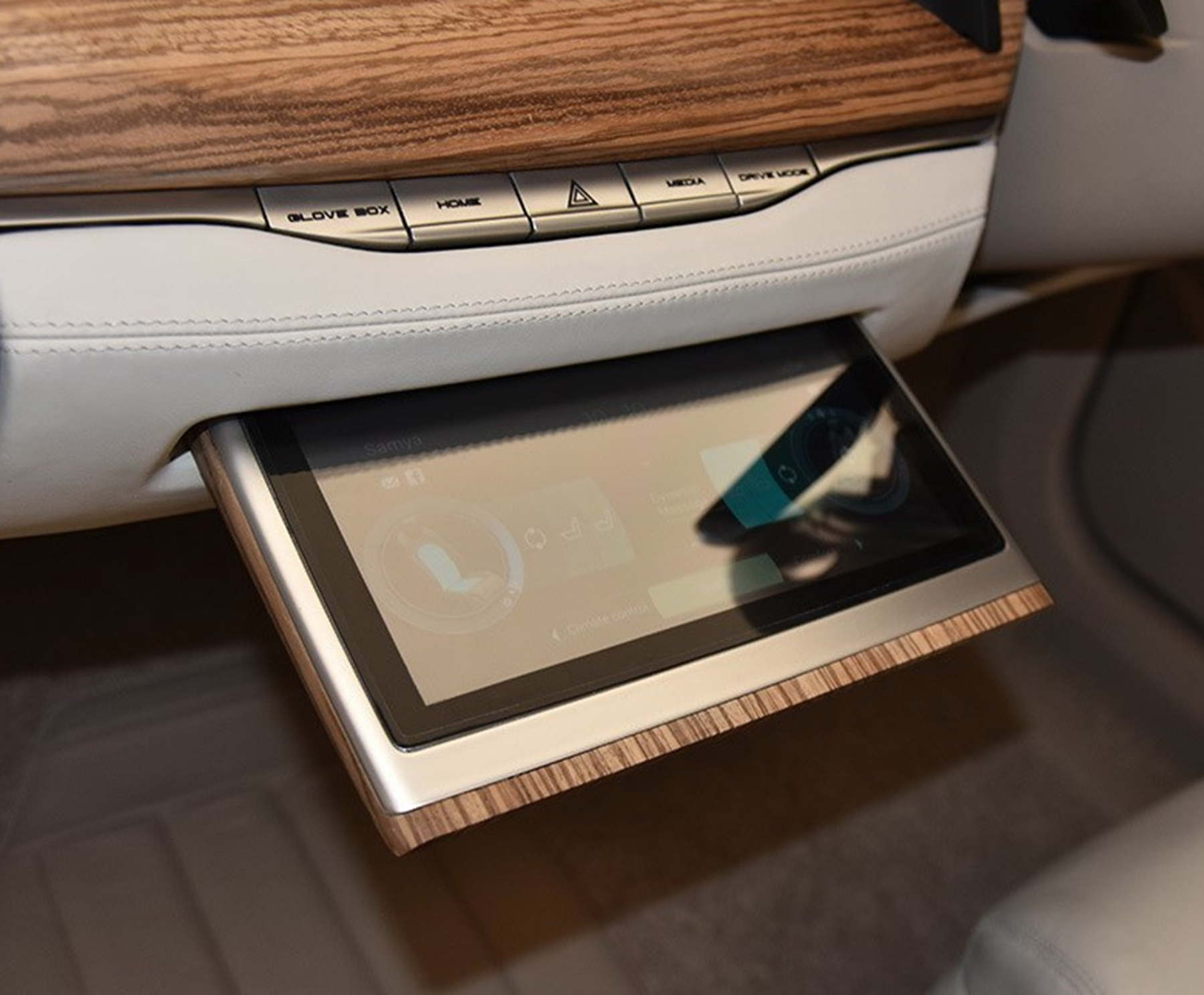 在中控台上增添了一些木纹元素,中控大屏的设计非常有创意,是从下方直接拉出来的。不得不说,这个设计小编真的跪服了。平时不用的时候,直接将屏幕推回去,用的时候再拉出来,非常方便,也不占空间。